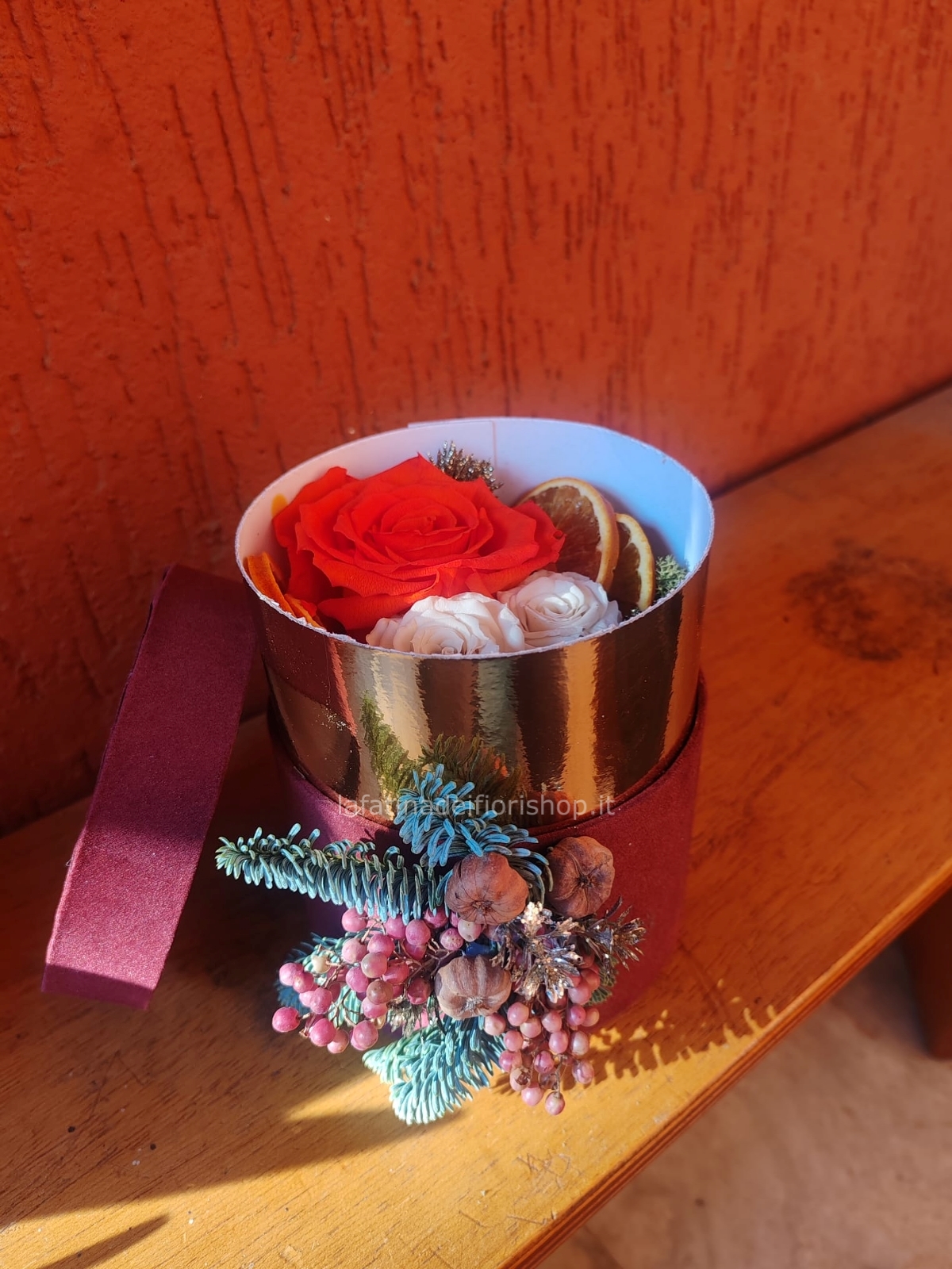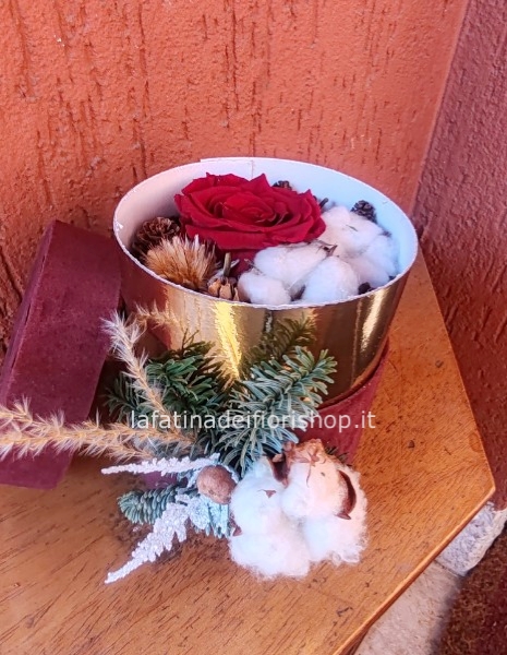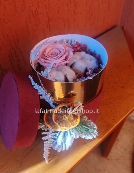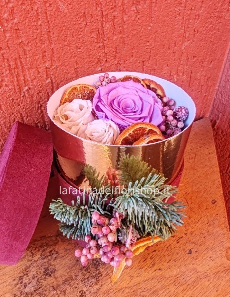 Box in velluto con decorazione natalizia con Rose stabilizzate interne e fiori eterni