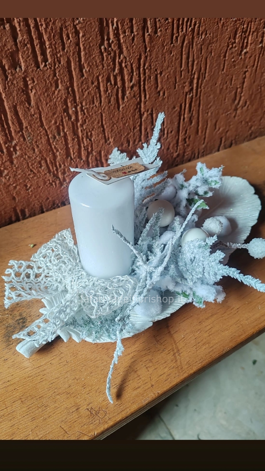 Composizione natalizia con candela su vassoio a forma di foglia bianca