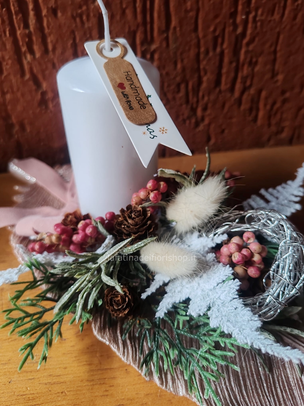 Composizione natalizia con candela su vassoio a forma di foglia rosa