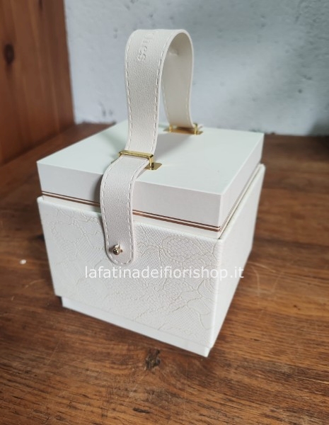 Scatola extra lusso rivestita in ecopelle con stampa pizzo decorata con 2 rose eterne. Un regalo di grande effetto e qualità. Potete chiedere di utilizzare i fiori veri al 3473964397.